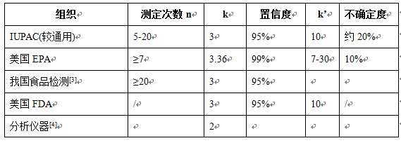 LOD=ks,LOQ=k’s通过空白或低浓度样品n次测量的标准偏差的倍数来表征检出限和定量限,从统计学的角度不同的k值来保证不同的置信度。这个取值及不同空白或低浓度样品的测定次数就是不同组织和机构的主要差别,但本质上来说是相通的,结果也是可比的,见表。
