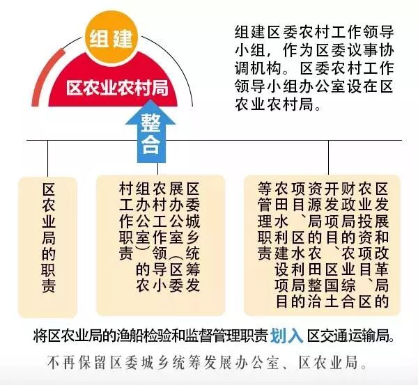 组建区委农村工作领导小组,作为区委议事协调机构。区委农村工作领导小组办公室设在区农业农村局。将区农业局的渔船检验和监督管理职责划入区交通运输局。不再保留区委城乡统筹发展办公室、区农业局。